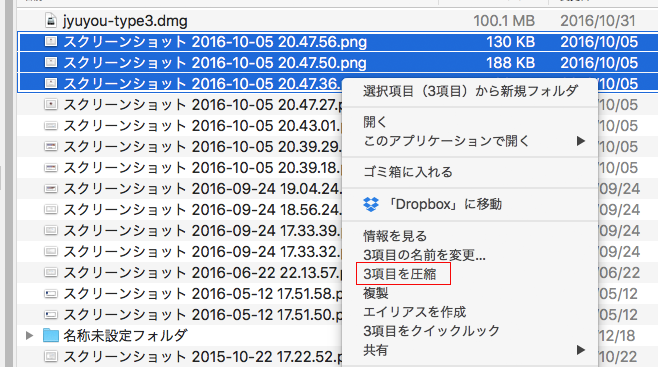 - 表示されたコンテキストメニューから[○○を圧縮]を選びます。○○は単独のファイルやフォルダの場合、その名称に、また、ファイル、フォルダを複数選択しているときは、[3項目を圧縮]などと項目数になります。