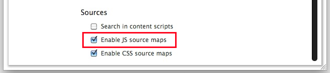 [デベロッパー ツール]の画面右上のギアアイコンをクリックして、[Settings]の画面を表示、[Sources]部分の[Enable JS source maps] にチェックが入っているか確認します(Windows8.1のGoogle Chrome 32.0.1700.76 mの場合)。